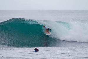 Kelly Slater ha pasado con bastantes apuros. Ha cojido bastantes olas y ha hecho una manga bastante regular. Pero Conner Coffin ha terminado su manga con 2 buenas olas. La última de ellas a falta de 1 minuto y medio con una derecha con 1 tubo bastante profundo que le ha valido para quedarse a 7 centésimas de Kelly.